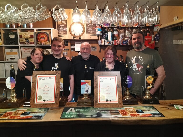 Congratulation to The Broomfield Tavern, 14-16 Broomfield Pl, Coventry CV5 6GY. For being name Coventry & District (West Midlands area) pub of the year 2026 & Cider pub of the year. well done to all the staff at “The Broom”. Pictured are Clare, Ed, Mike (Branch Chair), Ange (The Boss) & Danny.
