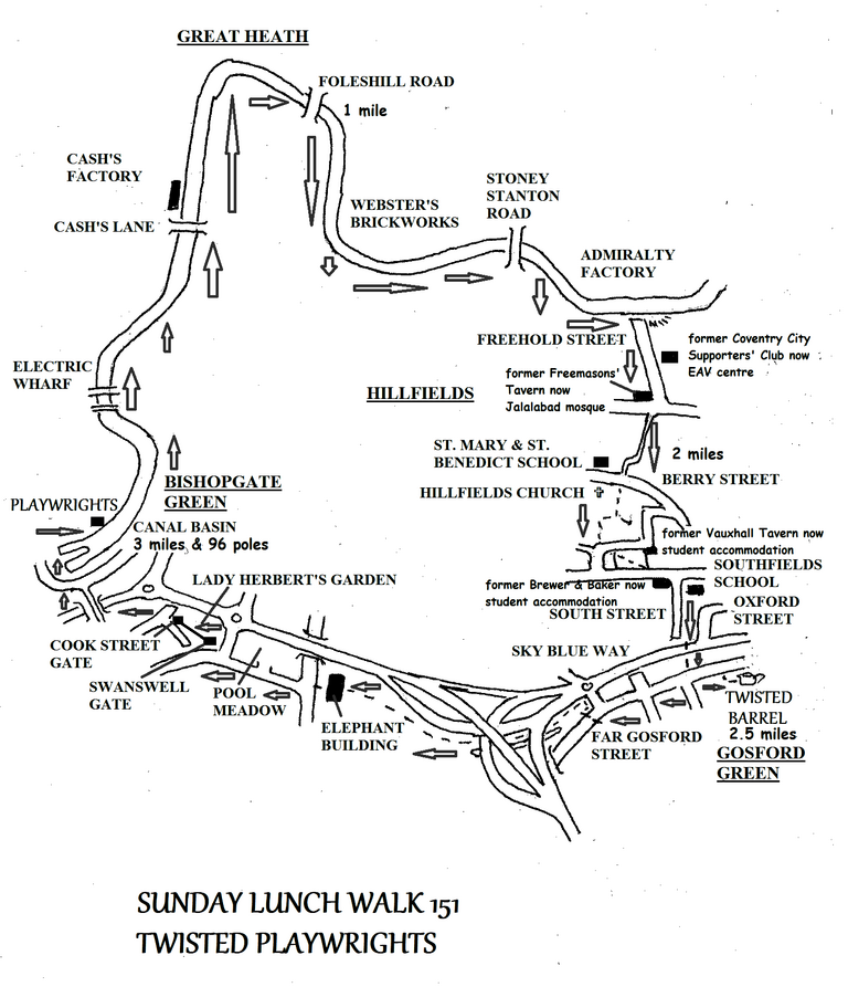 We meet at 12 noon at PLAYWRIGHTS CAFE in the canal basin. I found this walk fascinating for its historical aspect, both industrial, medieval and modern. At 12.30 we set off along the canal walking north from the basin, past Electric Wharf, through the old Courtaulds site and under Foleshill Road. The we pass the site of Webster’s brickworks on our left and pass under Stoney Stanton Road. After this we continue along the canal with the old Admiralty factory on the left bank. We turn into Freehold Street, which was developed by the Freehold Land Society, as were the original streets of Earlsdon. Half way along we pass the old Coventry City Supporters’ Club, now the EAV Centre, whatever one of those is. At the end of the street we pass the old Freemason’s Tavern, now the Jalalabad Mosque. We cross the road here and follow a footpath which passes St. Mary and St. Benedict’s School before crossing Berry Street. We continue to follow a path between housing to emerge onto Vauxhall Street near the old Vauxhall Tavern, now student accommodation.